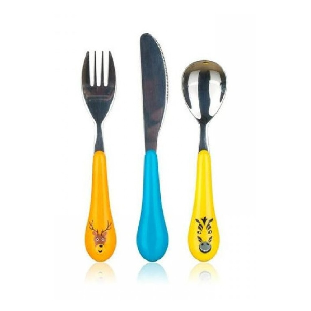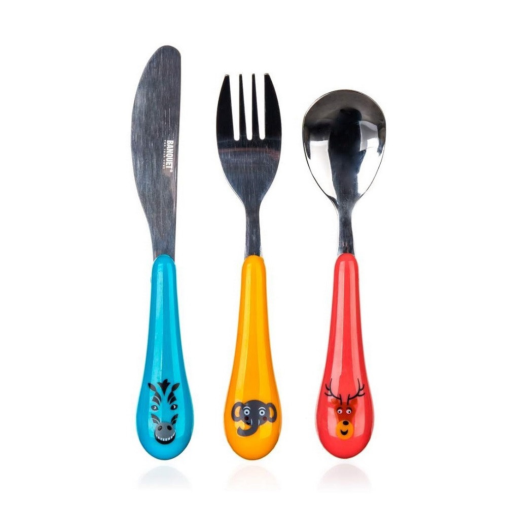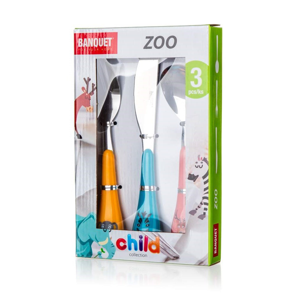 BANQUET ZOO gyermek evőeszközök állatos dekorral díszített, színes műanyag nyéllel, 3 darabos készletben. A szett evőkanalat, étkező villát és asztali kést tartalmaz. Az evőeszközök speciális formájúak, így a gyermek stabilan, biztonságosan kézben tudja tartani. A kés biztonságos élekkel, a villa finom fogakkal rendelkezik. A 3 darabos evőeszközkészlet jobb- és balkezes gyermekek számára egyaránt ideális. Használatával a gyermekek szívesebben fogyasztják el a kevésbé kedvelt ételeket is. Magas minőségű konyhai eszközök