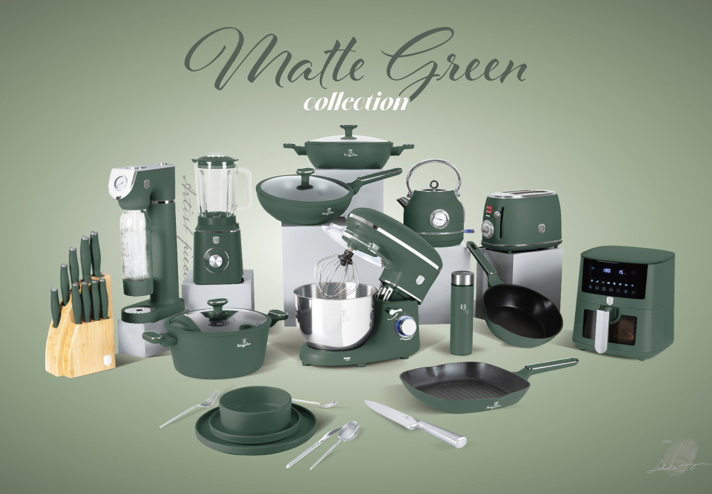 A BerlingerHaus Matte Green Collection családja a kifinomult eleganciát és a modern dizájnt ötvözi lenyűgöző matt zöld árnyalatban, amely tökéletesen illeszkedik minden konyhai stílushoz. A matt zöld színű kollekció azoknak készült, akik szeretnék konyhájukat egységes, harmonikus és stílusos környezetté varázsolni.