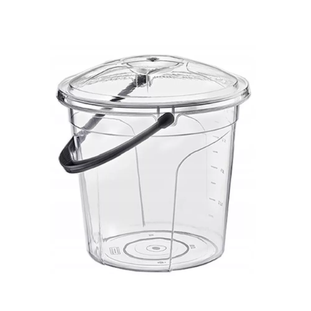 Átlátszó fedeles vödör, az oldalán mércével. Az átlátszó kivitelnek köszönhetően a vödör tartalma jól látható a falán keresztül is. Praktikus tetős kialakítása révén elkerülhető, hogy a vödör tartalmát szennyeződés érje. Kényelmes fogást biztosító füllel van ellátva. Magas minőségű műanyagból készült takarítóeszköz, háztartási termék. A  POLY TIME márka kedvelt terméke.