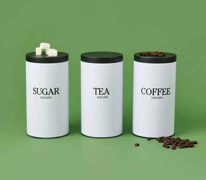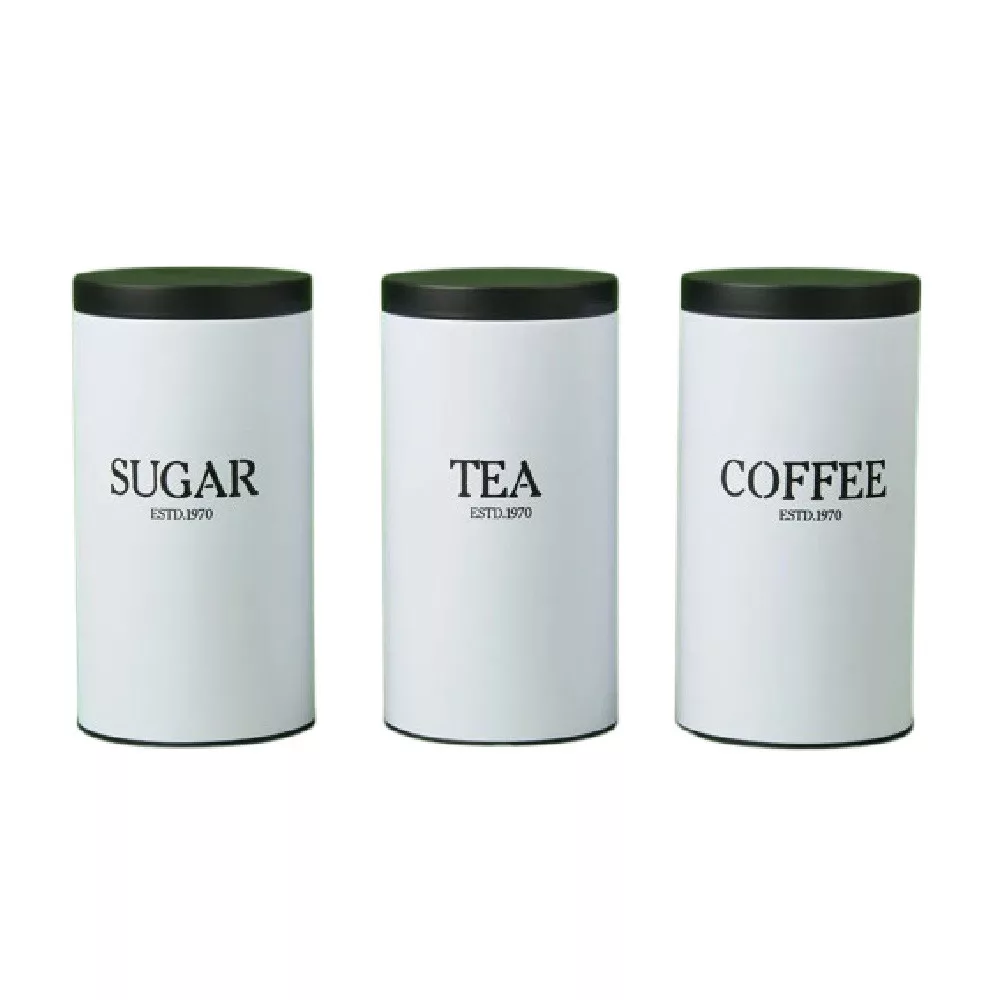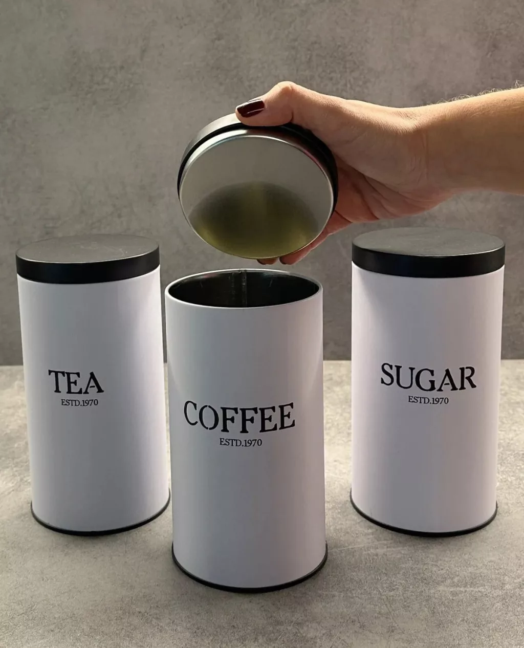 Kávé-, tea- és cukortartóból álló 3 darabos, fehér színű fém doboz szett. A feliratos dobozok fém vákuum fedéllel vannak ellátva és ennek köszönhetően légmentesen záródnak. Dekoratív termékek, minden konyhában jól mutatnak.