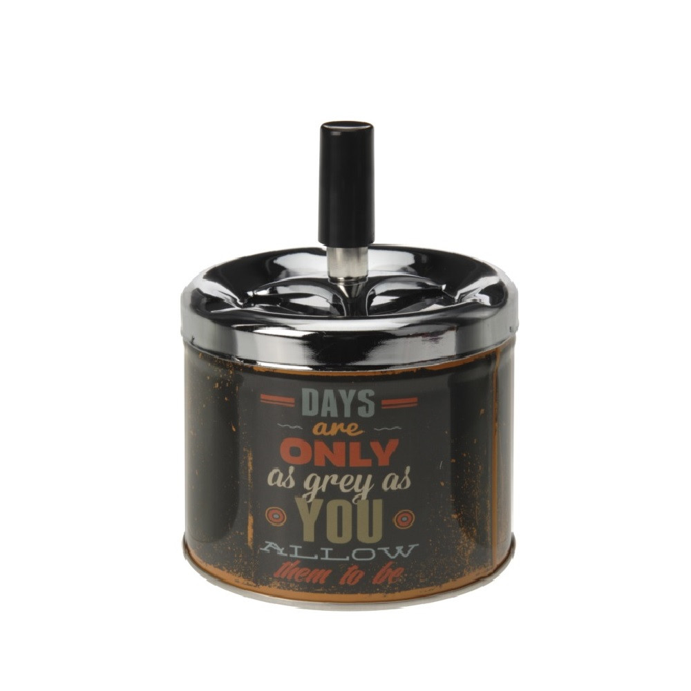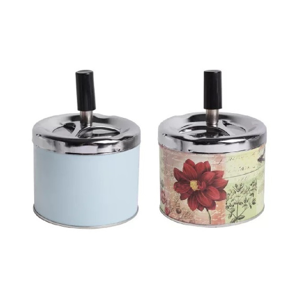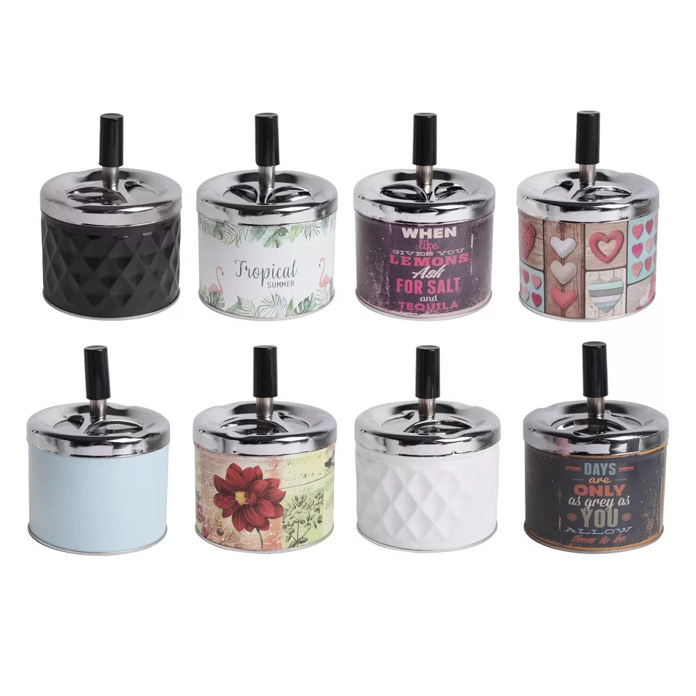 Rugós, szélforgós hamutartó, retro háztartási termék modern kivitelben, többféle dekorral. A tetején lévő gomb lenyomásával lehet eltüntetni a hamut és a csikket és ezzel együtt a kellemetlen szagokat is. Ürítése egyszerű, a hamutál tetejének megcsavarásával könnyedén ki lehet önteni a cigaretta maradványokat.