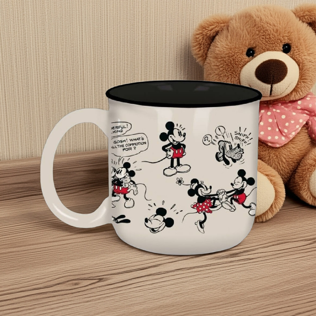 Mickey Mouse reggeliző kerámia bögre a kicsik és nagyok kedvenc Mickey egér figurájával, amely a teljes felületet beborítja. Kényelmes füle biztonságos fogást tesz lehetővé. Magas minőségű anyagból készült, törékeny ivópohár. Dekoratív konyhai eszköz.