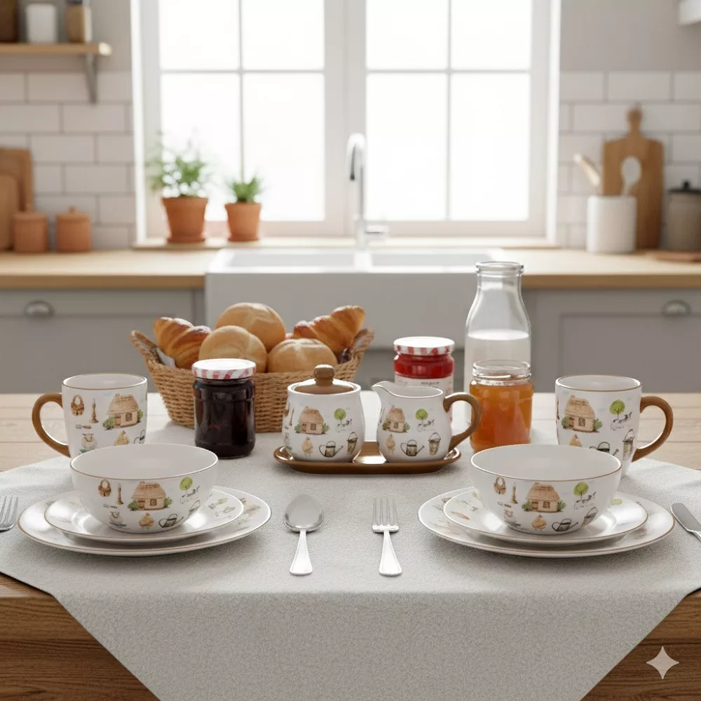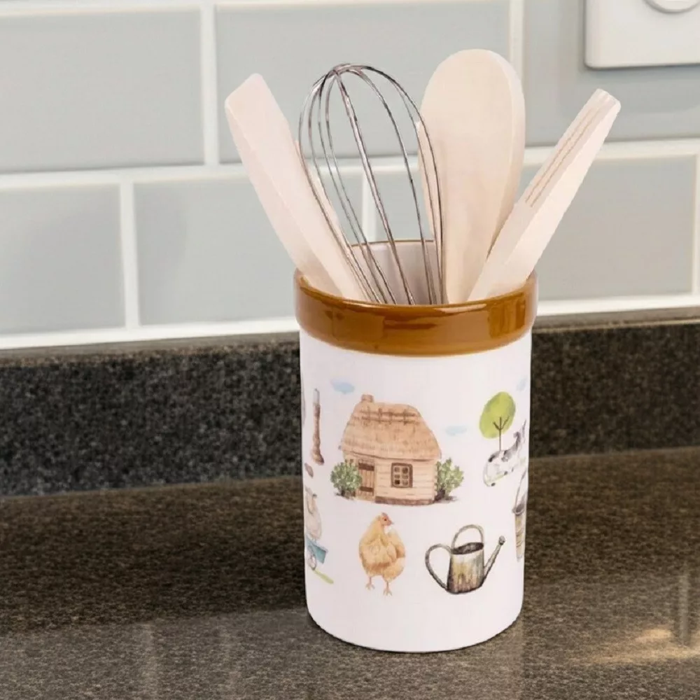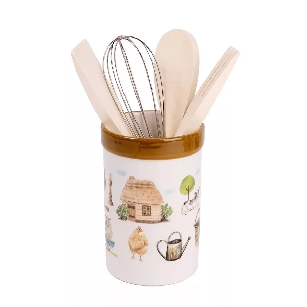 Happy farm mintás, dekoratív, vintage stilusú kerámia konyhai eszköz tartó szett. A készlet tartalmazza a fakanalakat és habverőt is.