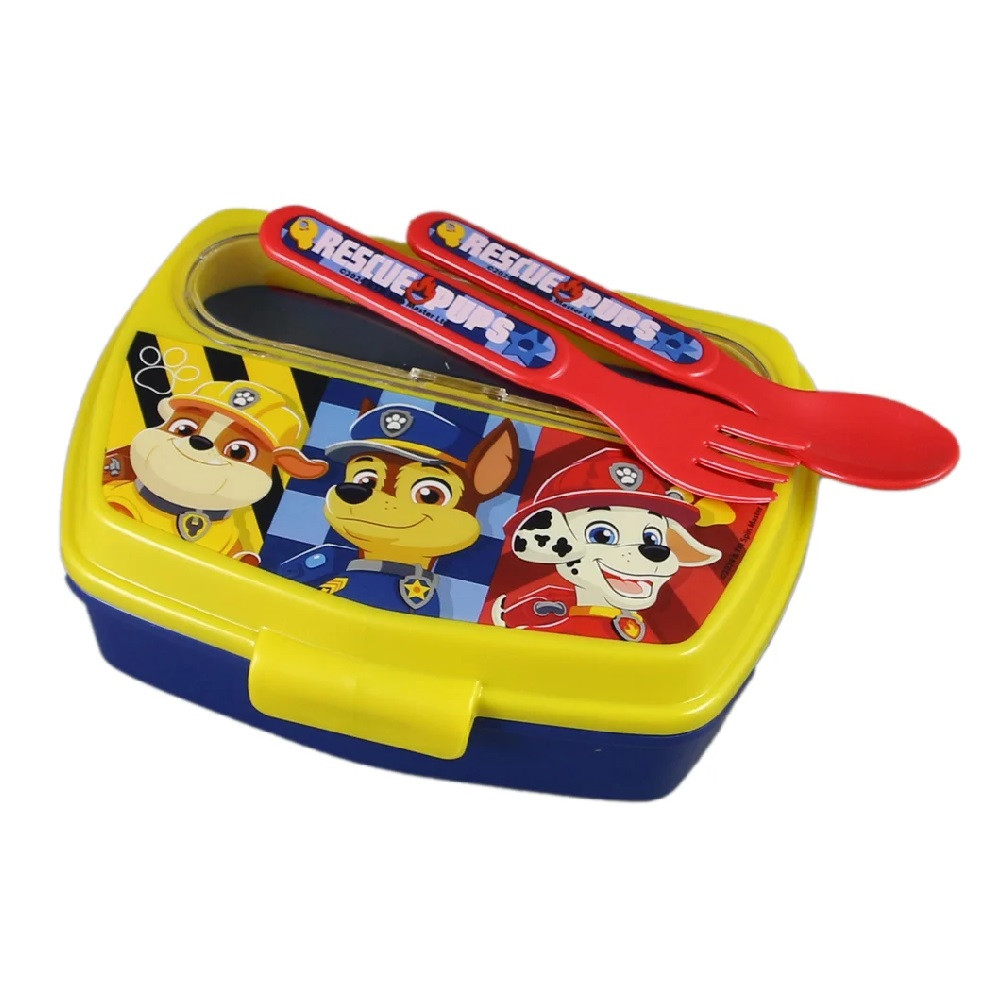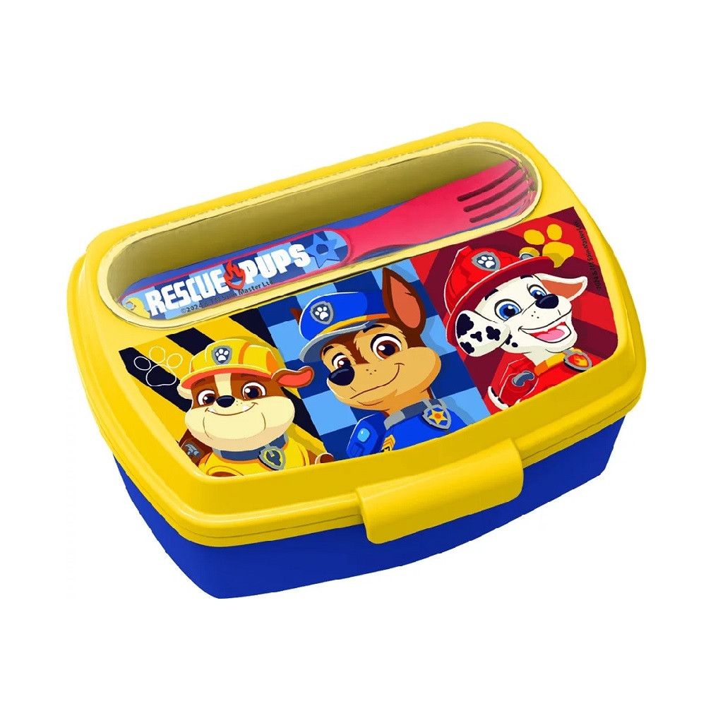 Mancs Őrjárat szendvicsdoboz, amely nem csak a kedvenc mesehősökkel díszített, de a praktikus beépített evőeszközöknek köszönhetően a komplett étkezés kényelmét is biztosítja. A doboz rekeszében praktikus, a dobozhoz illő kanál és villa található, így gyermeknek nem kell külön evőeszközt csomagolni.