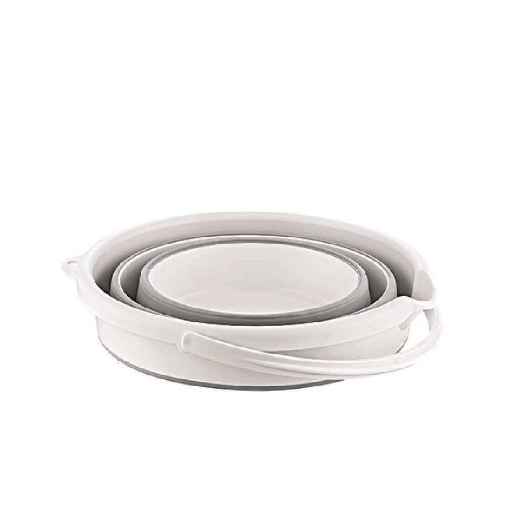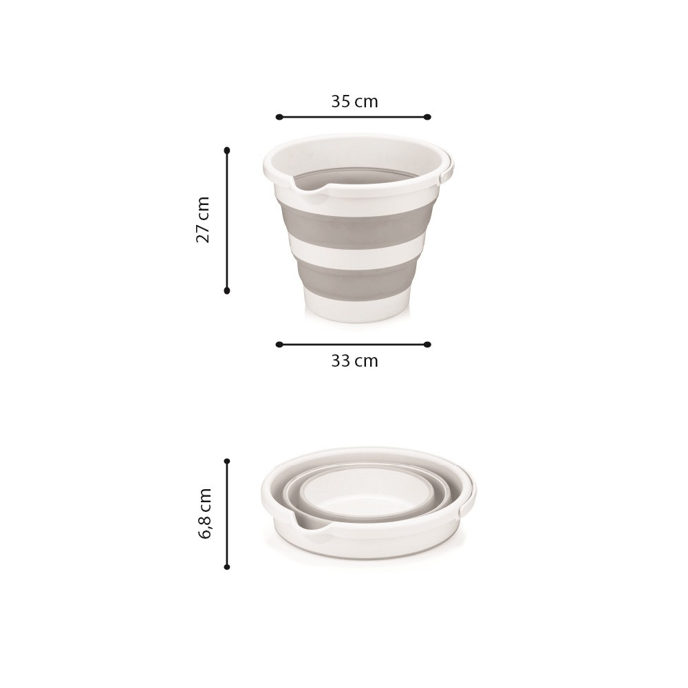 Összecsukható vödör többféle modern színösszeállításban. Ez a praktikus fürdőszobai eszköz kivitele révén könnyen összecsukható és helytakarékosan tárolható, akasztójával akár a falon is.