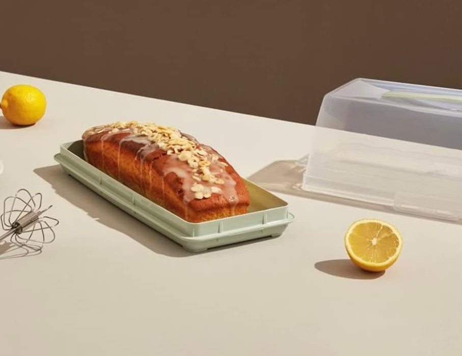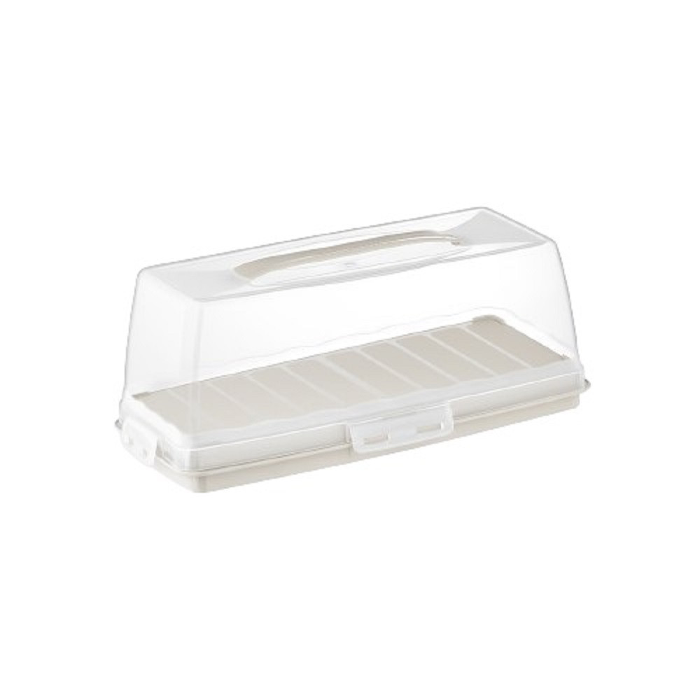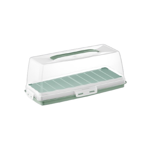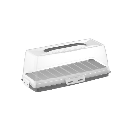 Szögletes formájú süteménytartó tálca átlátszó búrával, amelyen át jól látható a benne tárolt sütemény, szendvics vagy egyéb élelmiszer. A fedél 4 pattintózárral szorosan, biztonságosan záródik, így védelmet nyújt a szennyeződéssel, rovarokkal, nedvességgel szemben.