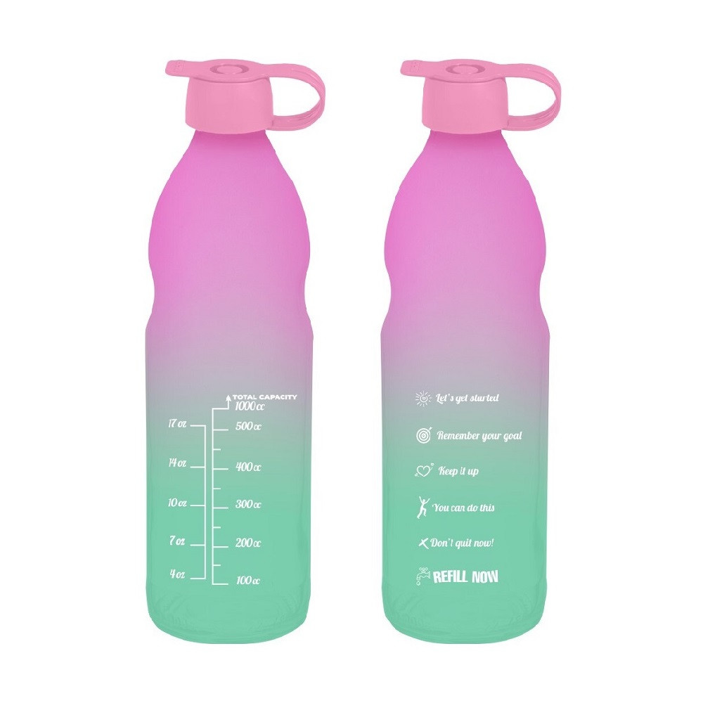 Színátmenetes sport üveg palack pink alapszínben, egyik oldalán mércével, a másikon motivációs mondatokkal. Használhatja sportoláshoz, rövid kirándulásokhoz, piknikhez, iskolában, irodában és otthon, hogy kielégítse napi folyadékszükségletét.