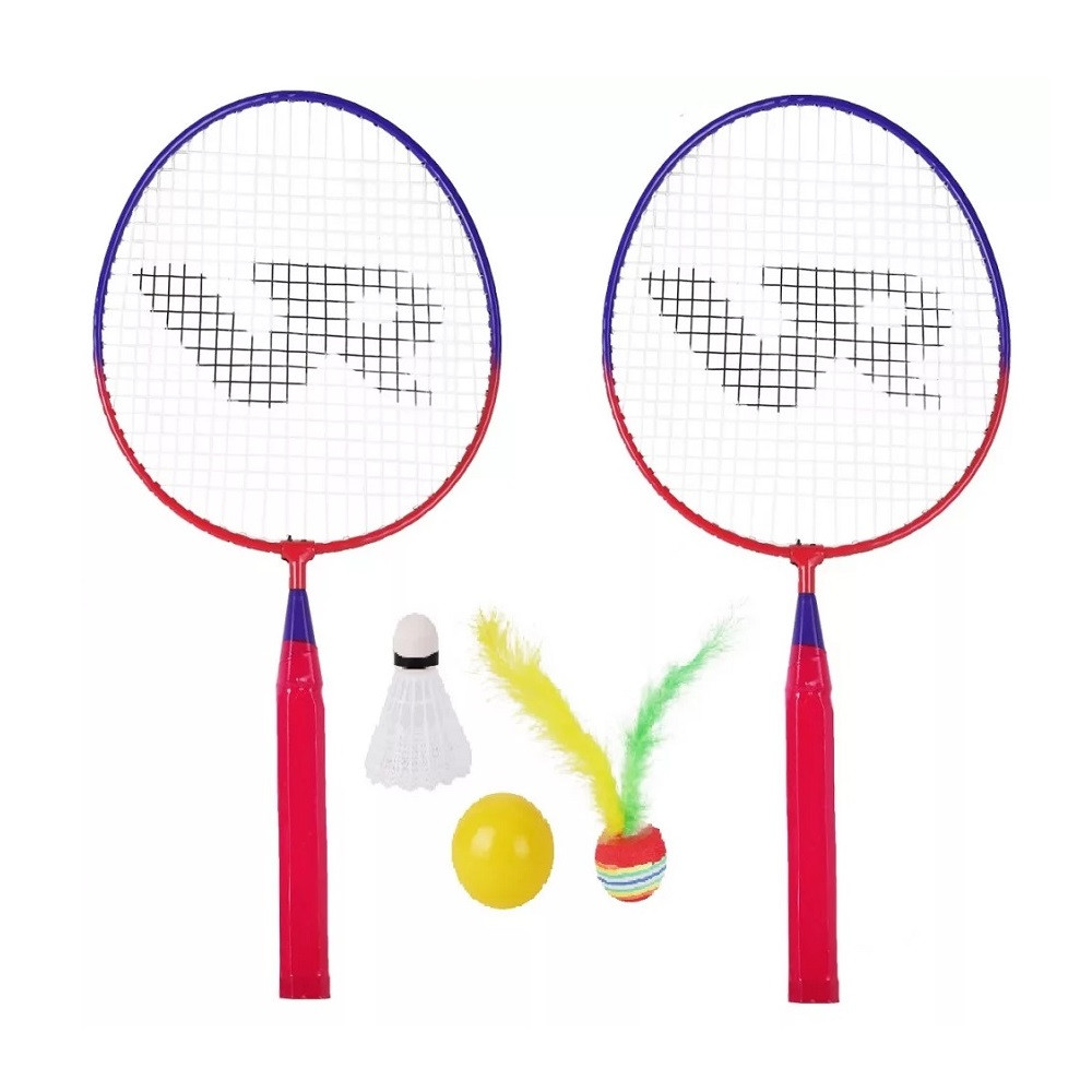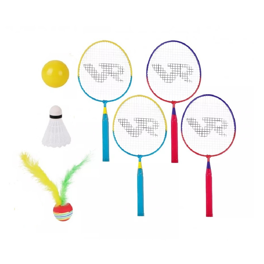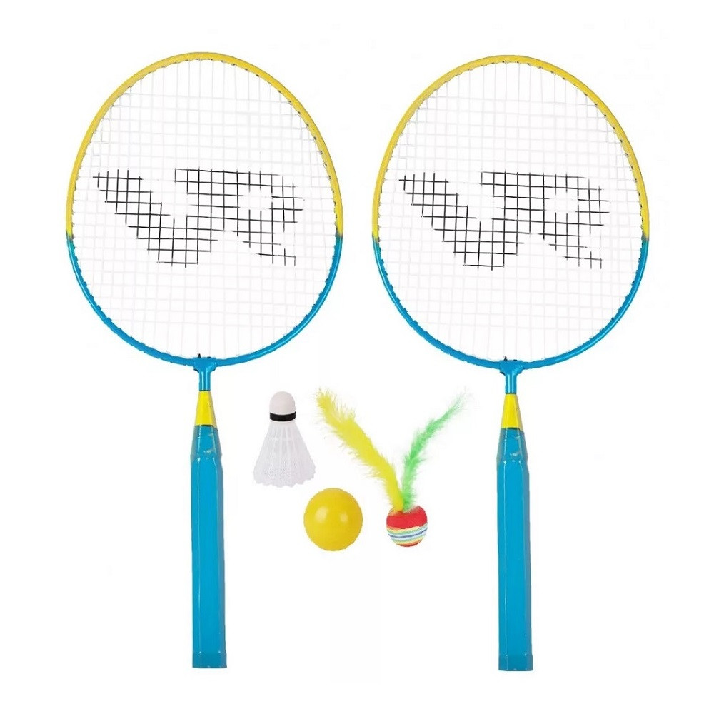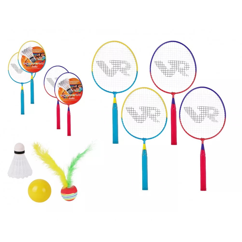 Tollasütő készlet gyerekeknek 2 darab ütővel és 3 darab különböző labdával (1 darab klasszikus tollaslabdával, 1 műanyag labdával és 1 darab marabútollas labdával). Az ütők a gyerekek karjához igazított rövid nyelűek, fémkeretesek, damil húrozásúak, markolatuk kék vagy piros fólia borítású.