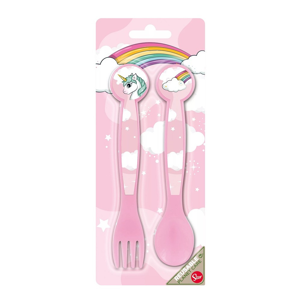Unikornis mintás 2 darabos evőeszköz szett, amely egy kanalat és egy villát tartalmaz. Az evőeszközök tökéletesen illeszkednek a kisebb kezekbe, segítve a kicsiket az önálló étkezés elsajátításában. A népszerű és kedvelt Unikornis minta garantáltan mosolyt csal a gyermekek arcára. Ez a műanyag evőeszköz készlet praktikus és szórakoztató kiegészítője a mindennapi étkezéseknek, legyen szó otthoni ebédekről vagy kirándulásról.
