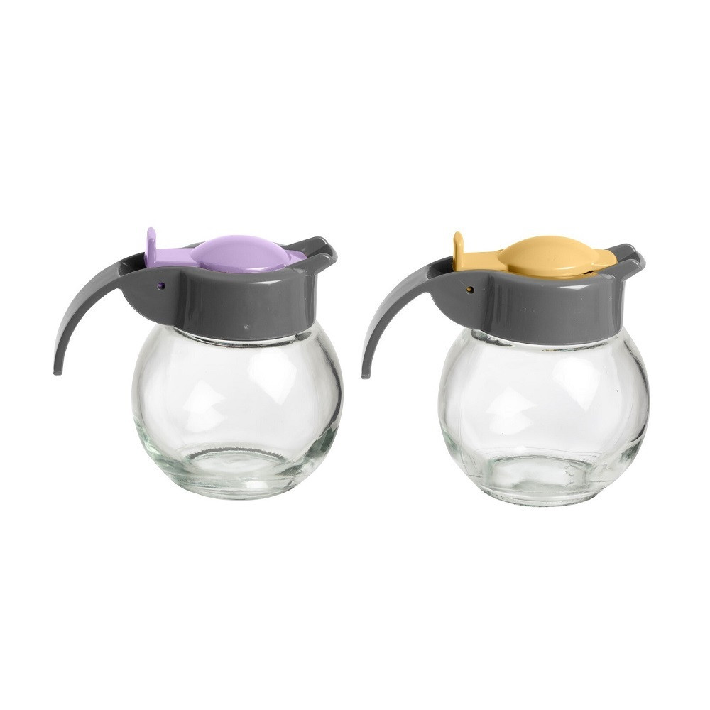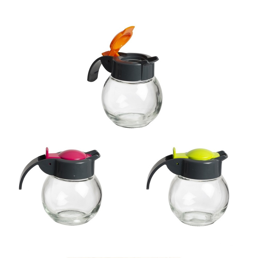 Kiöntő üveg dekoratív színes tetővel és fogantyúval, a reggeliző asztal kötelező, elegáns és praktikus kelléke. Alkalmas tej, olaj, ecet, citromlé, valamint mártások, szószok, tartár, mustár, stb. adagolásához.
